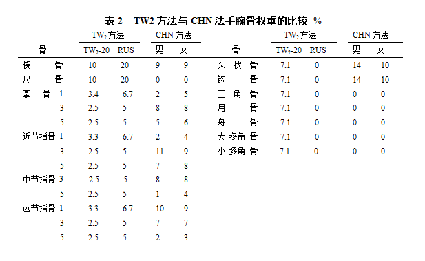 三、根据长期应用TW2的经验,在TW3方法中已经不再使用20块骨的评价方法,而CHN法是在TW2-20基础上进行的权重计算,并导致了不同骨之间的权重差异过大。